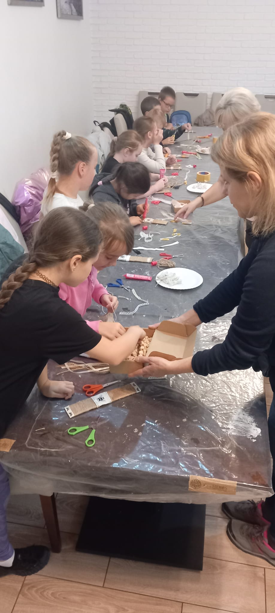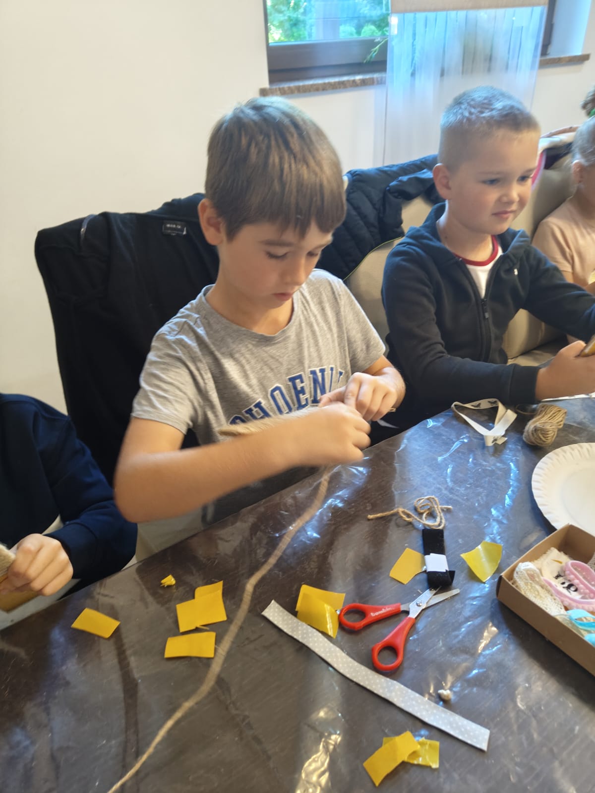 Uczniowie poznali również zasady budowania domków dla owadów, które wspierają ochronę zapylaczy. Dzieci z zaangażowaniem i uważnością układali naturalne materiały- drewno, szyszki i bambusowe rurki- tworząc bezpieczne schronienia dla pszczół murarek i innych pożytecznych owadów