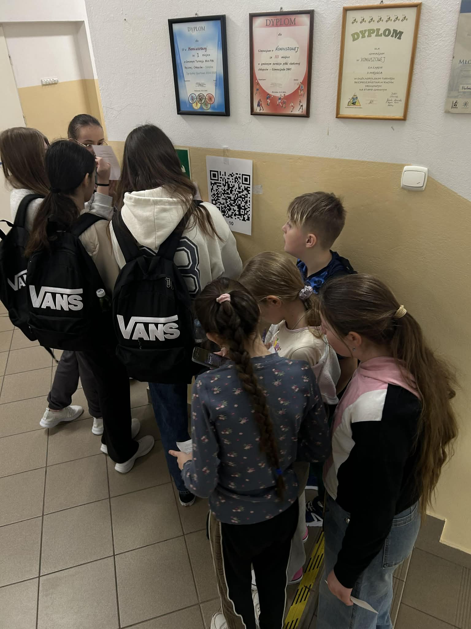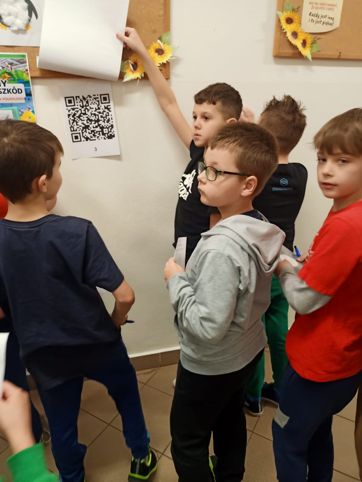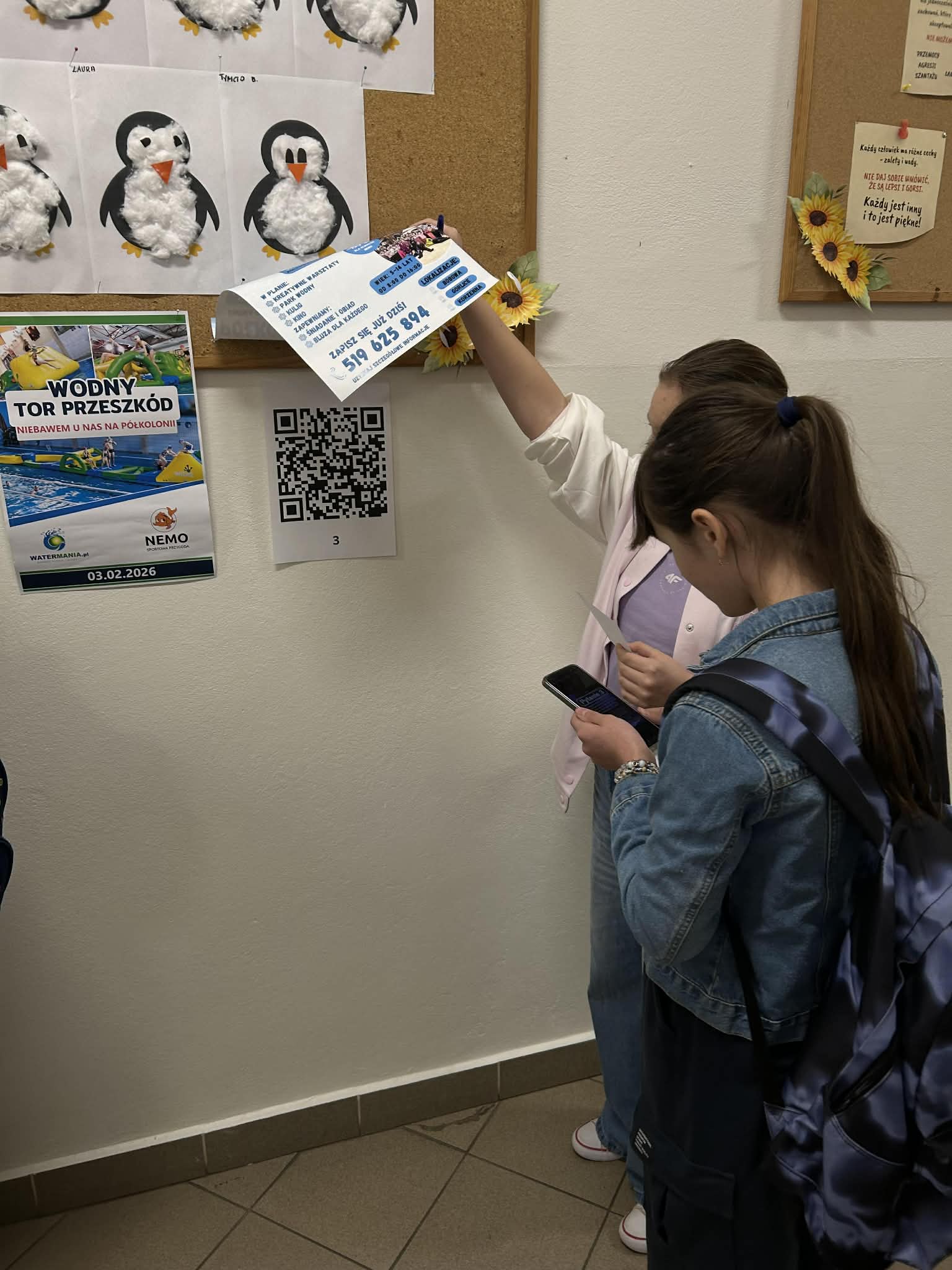 W ramach gry terenowej „Cyberbezpieczni Odkrywcy” uczestnicy szukali na szkolnych korytarzach ukrytych kodów QR, skanowali je i rozwiązywali zadania dotyczące cyberbezpieczeństwa.
