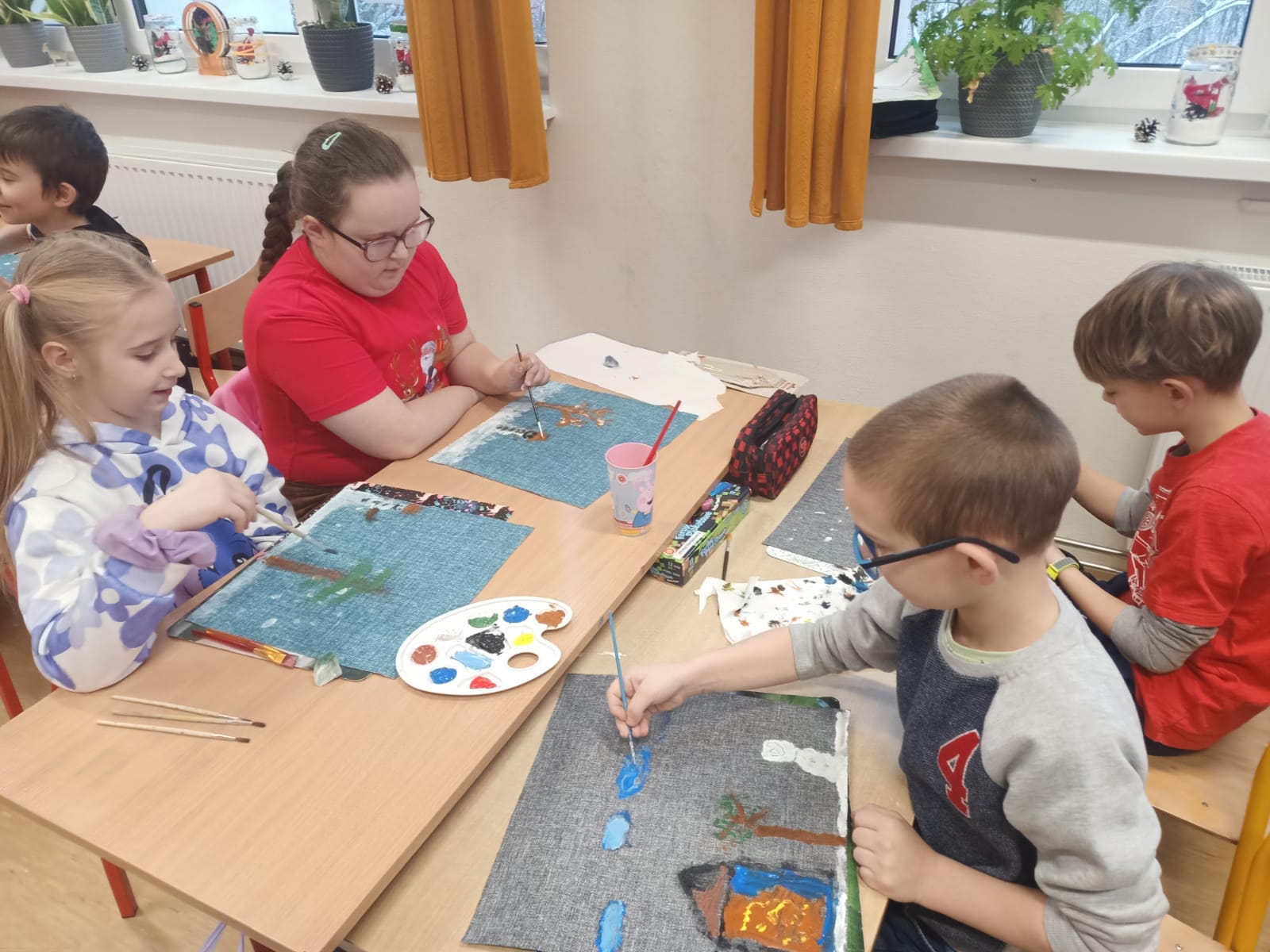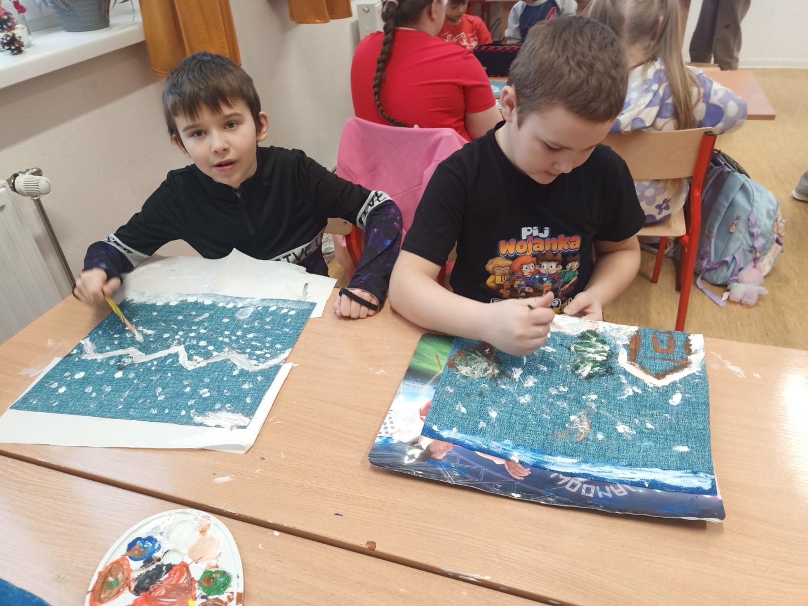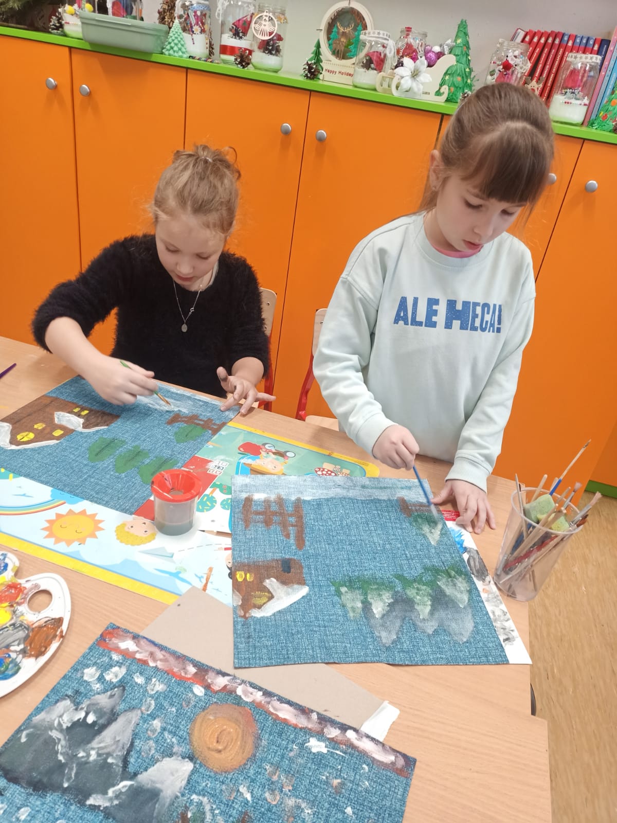 -malowali zimowe krajobrazy na płótnie, wykorzystując farby.