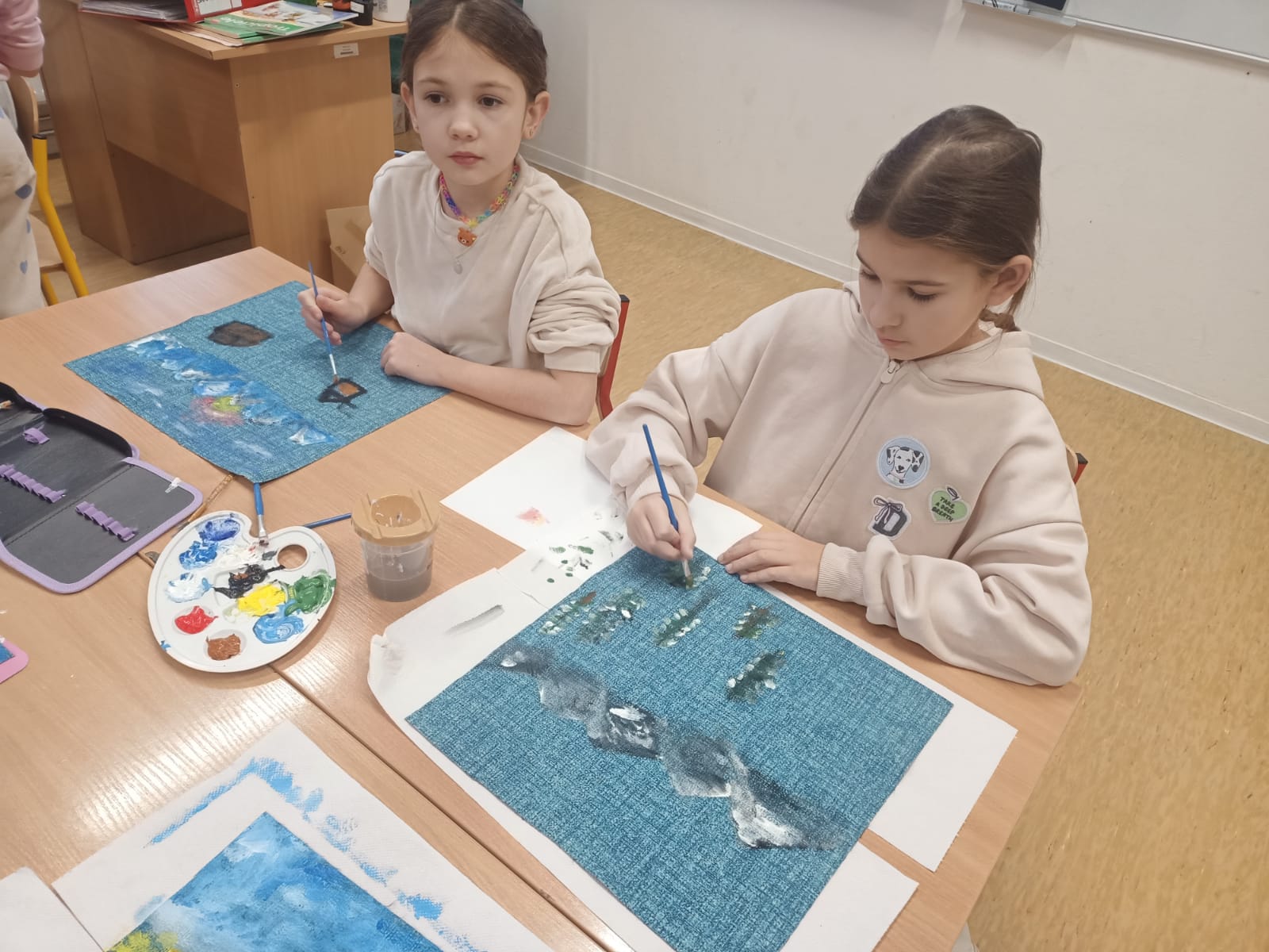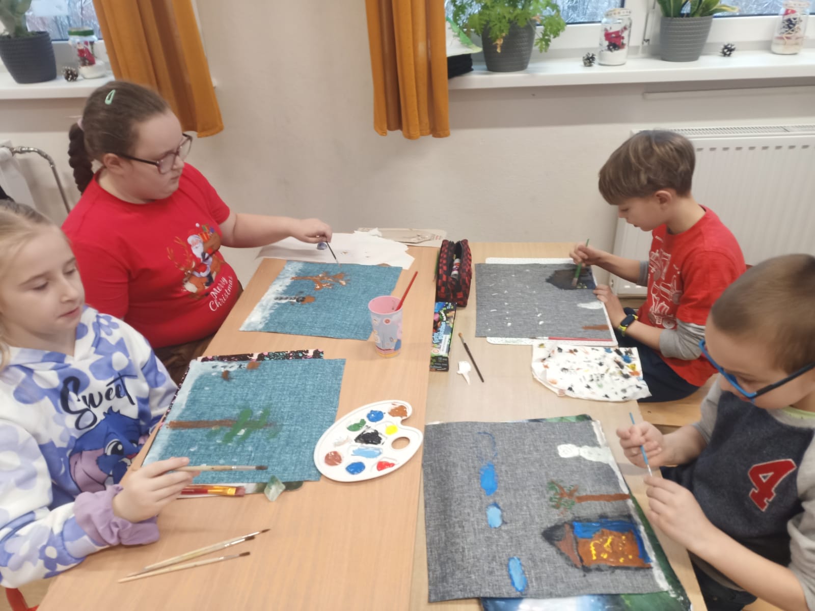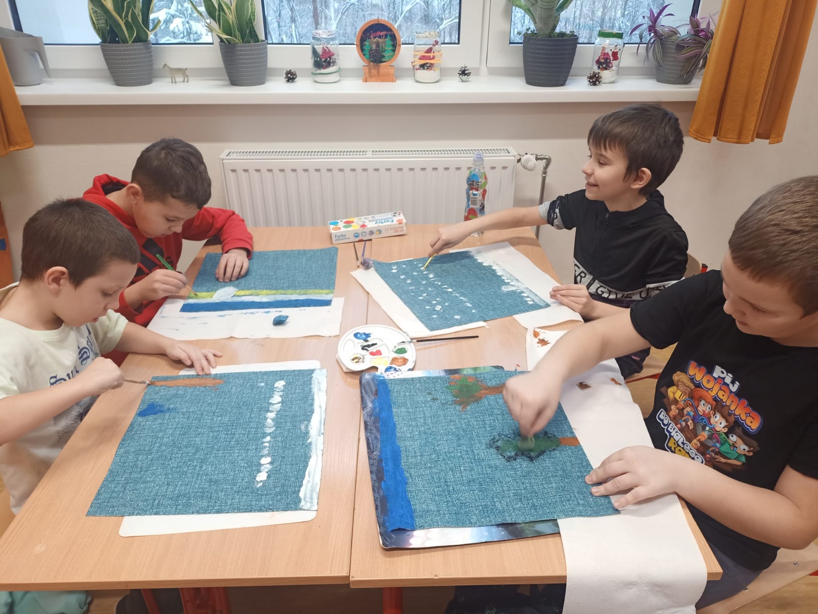 -malowali zimowe krajobrazy na płótnie, wykorzystując farby.
