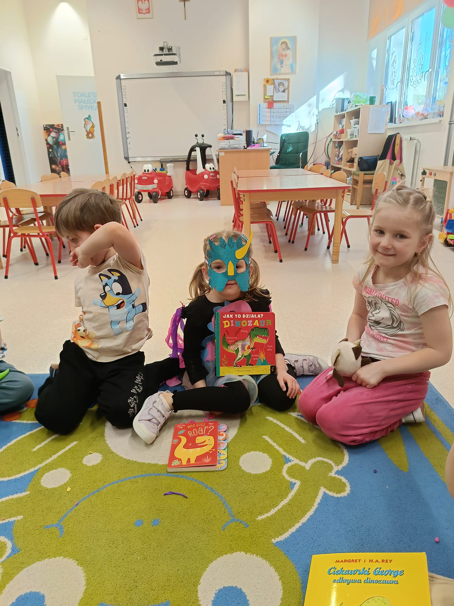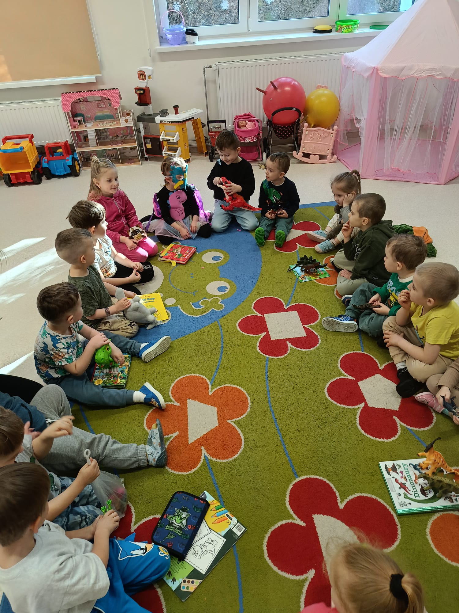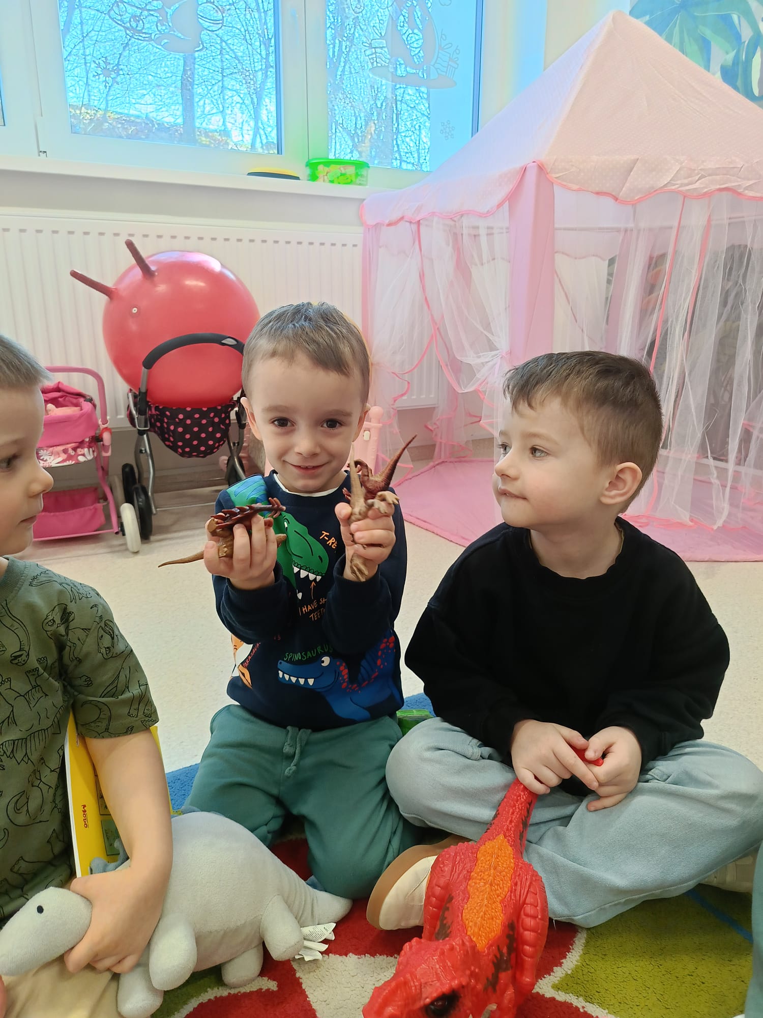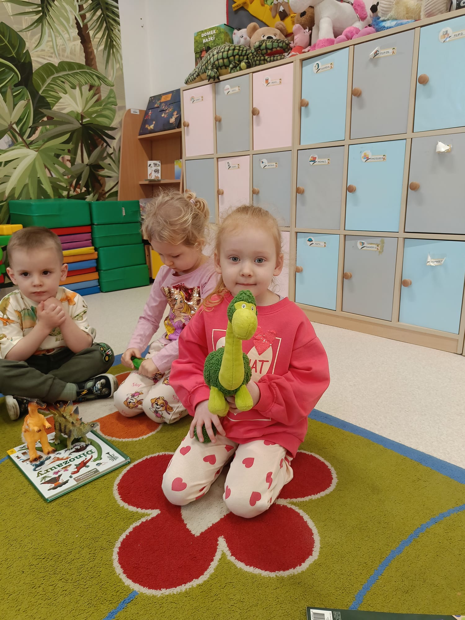 Już od samego rana sala zamieniła się w prawdziwą krainę dinozaurów. Dzieci przyniosły figurki i książeczki o tych niezwykłych stworzeniach. Wspólnie oglądaliśmy ilustracje, poznawaliśmy nazwy wybranych dinozaurów oraz ciekawostki na temat ich życia. Przedszkolaki dowiedziały się, kim jest paleontolog i na czym polega jego praca.