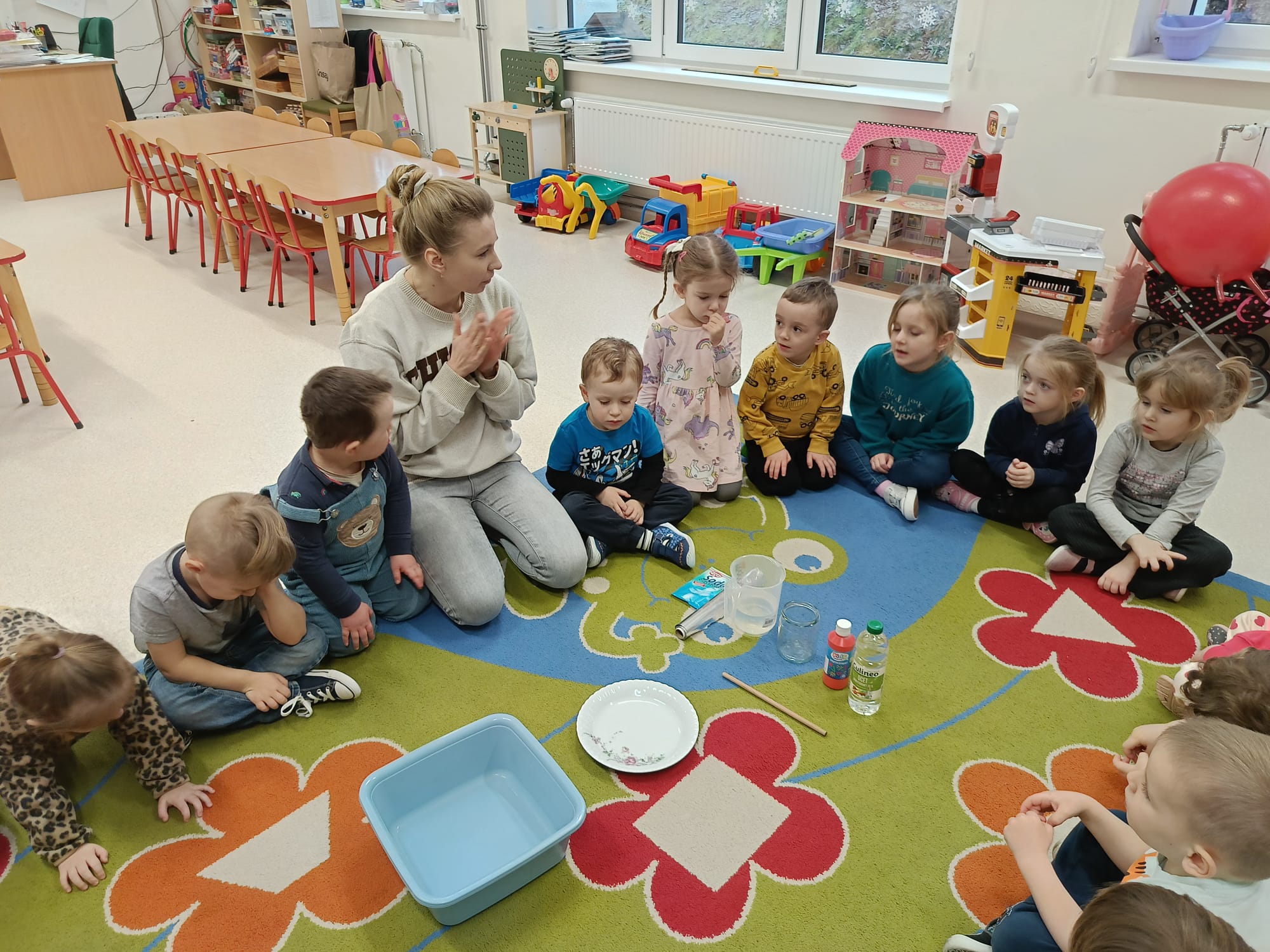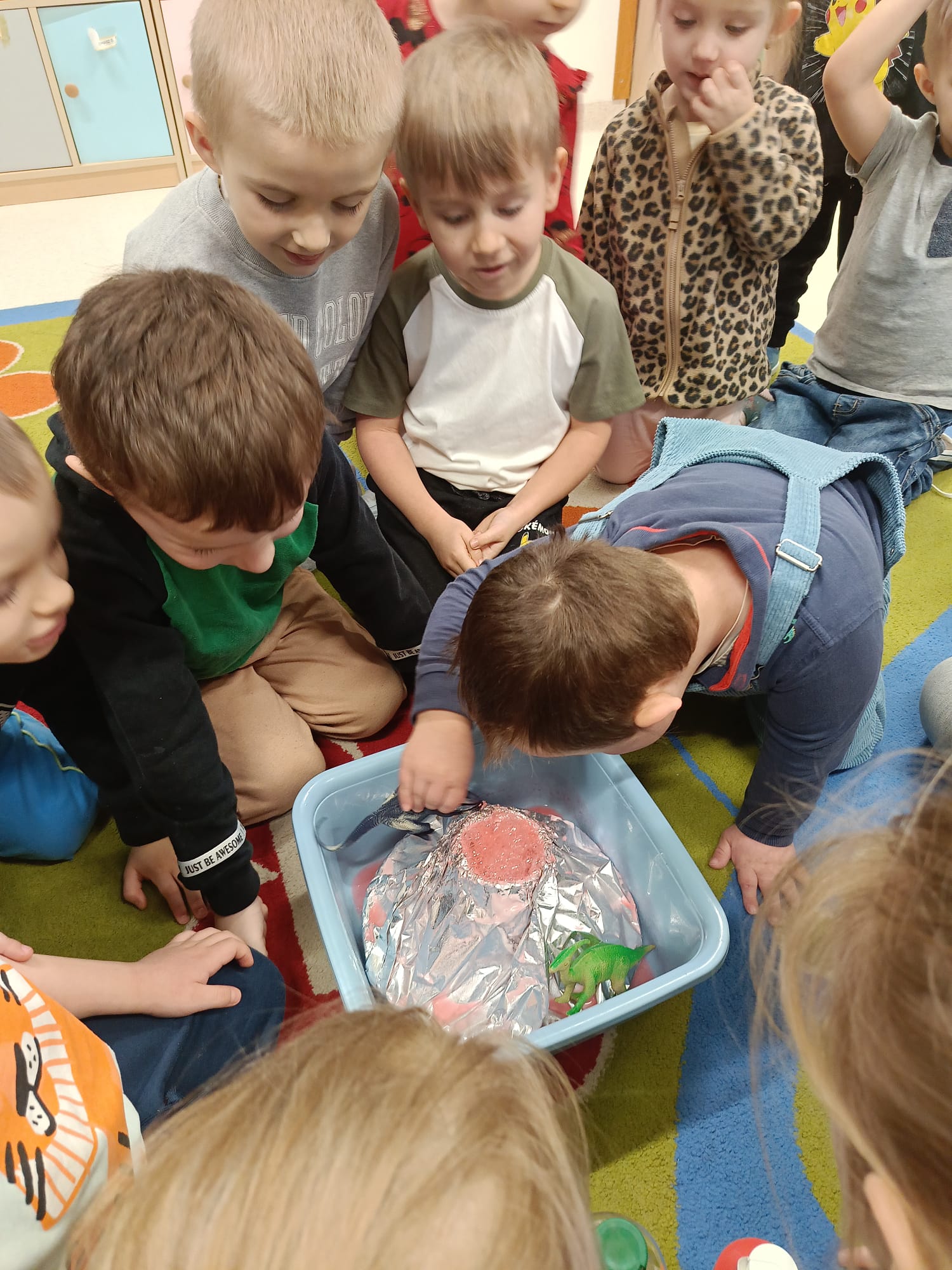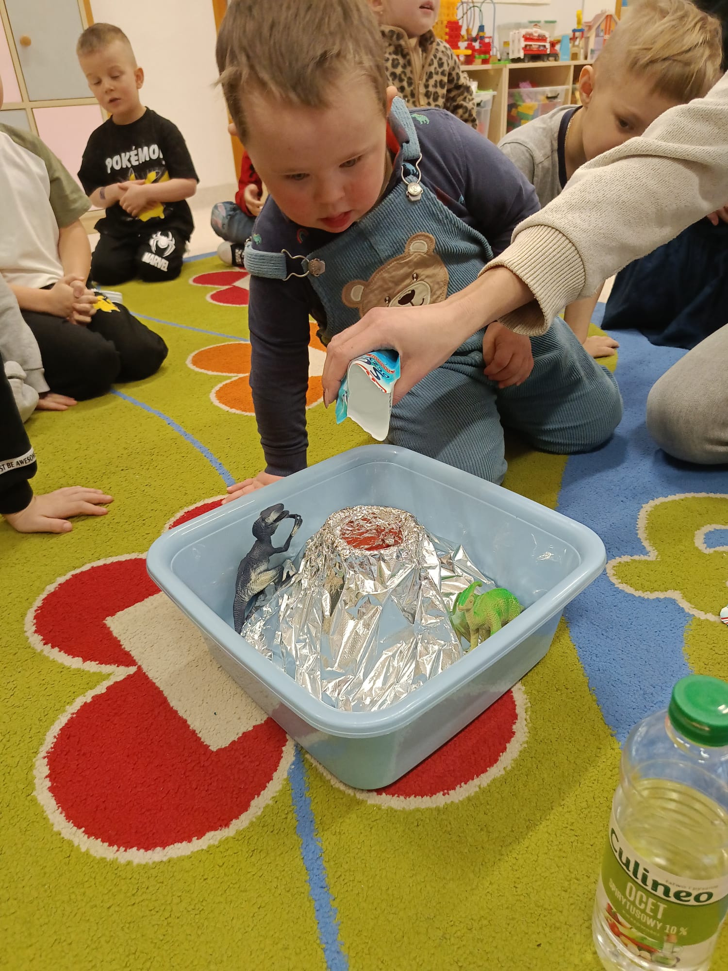 Lepienie wulkanu z masy sensorycznej, rozwijało kreatywność i sprawność manualną. Dzieci mogły dotykać, formować i eksperymentować, a pokaz „erupcji” wzbudzał ogromne emocje i ciekawość świata.