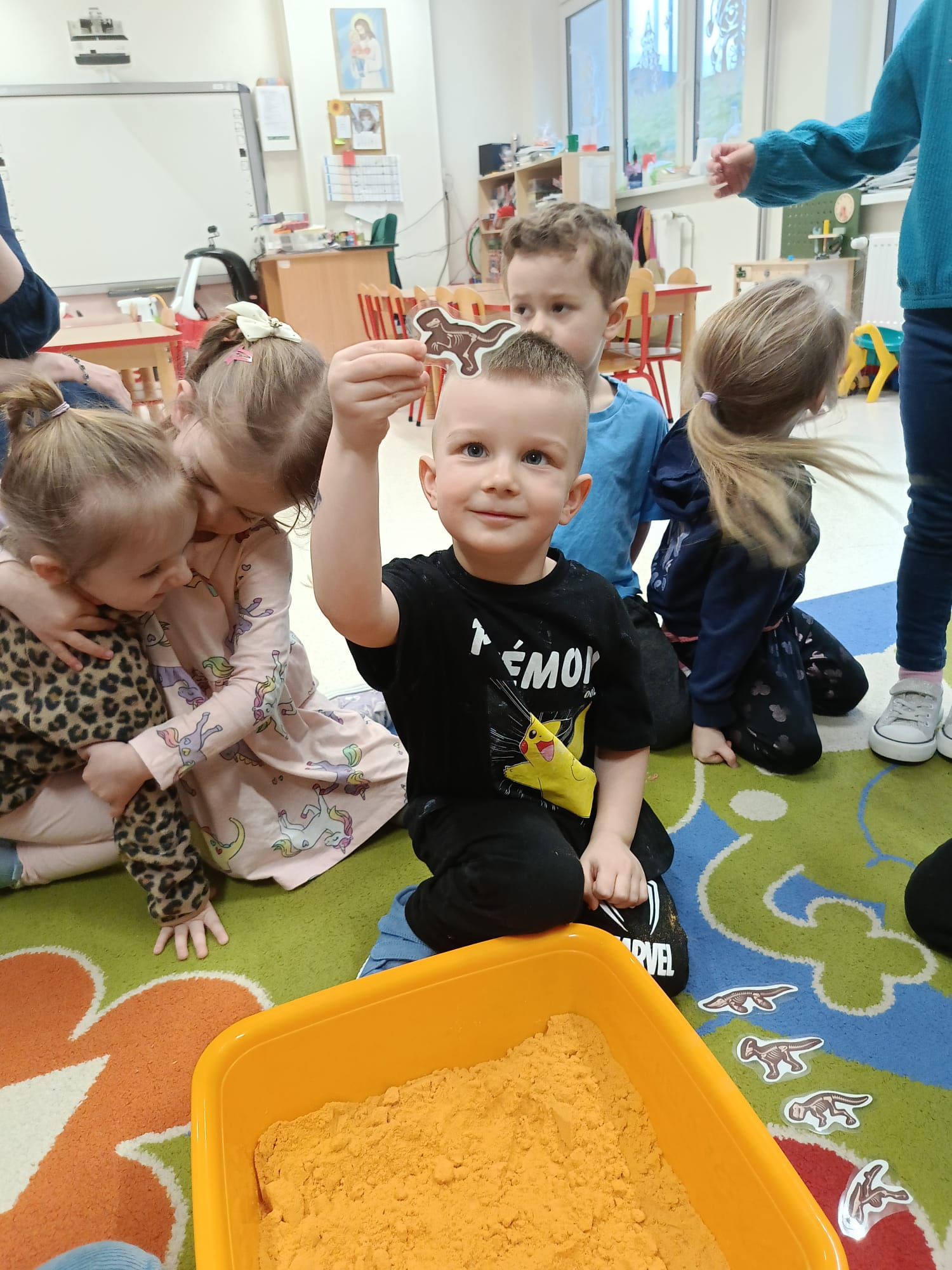 Ogromną atrakcją okazały się „wykopaliska”. Mali badacze z wielkim zaangażowaniem odszukiwali ukryte w piasku szkielety dinozaurów, ćwicząc przy tym cierpliwość i precyzję ruchów.
