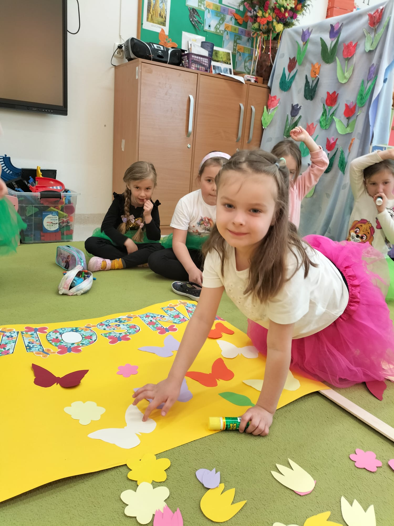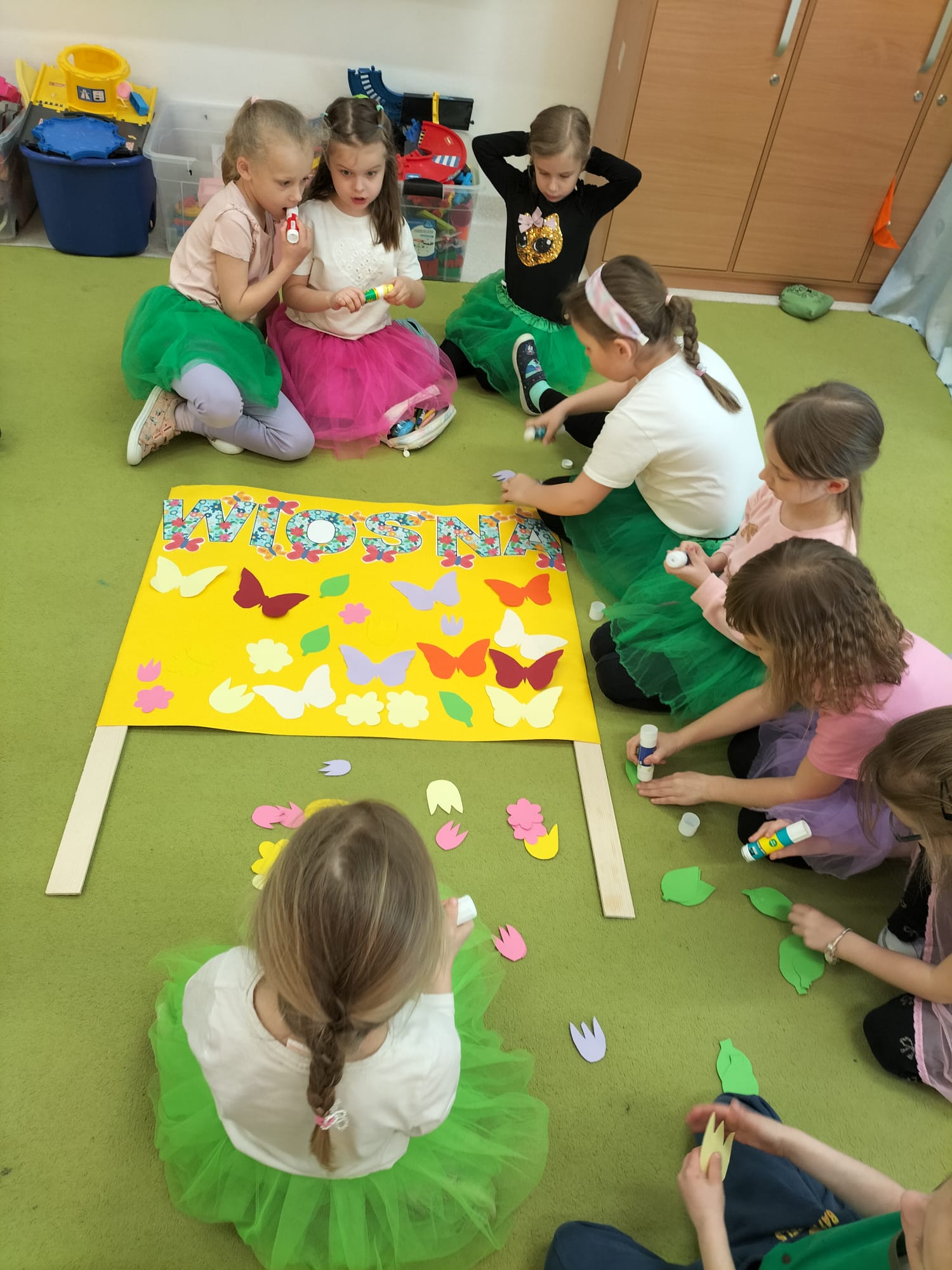 Starszaki z wielkim zaangażowaniem przygotowały kolorowy baner z napisem „Wiosna”, ozdabiając go kwiatami,